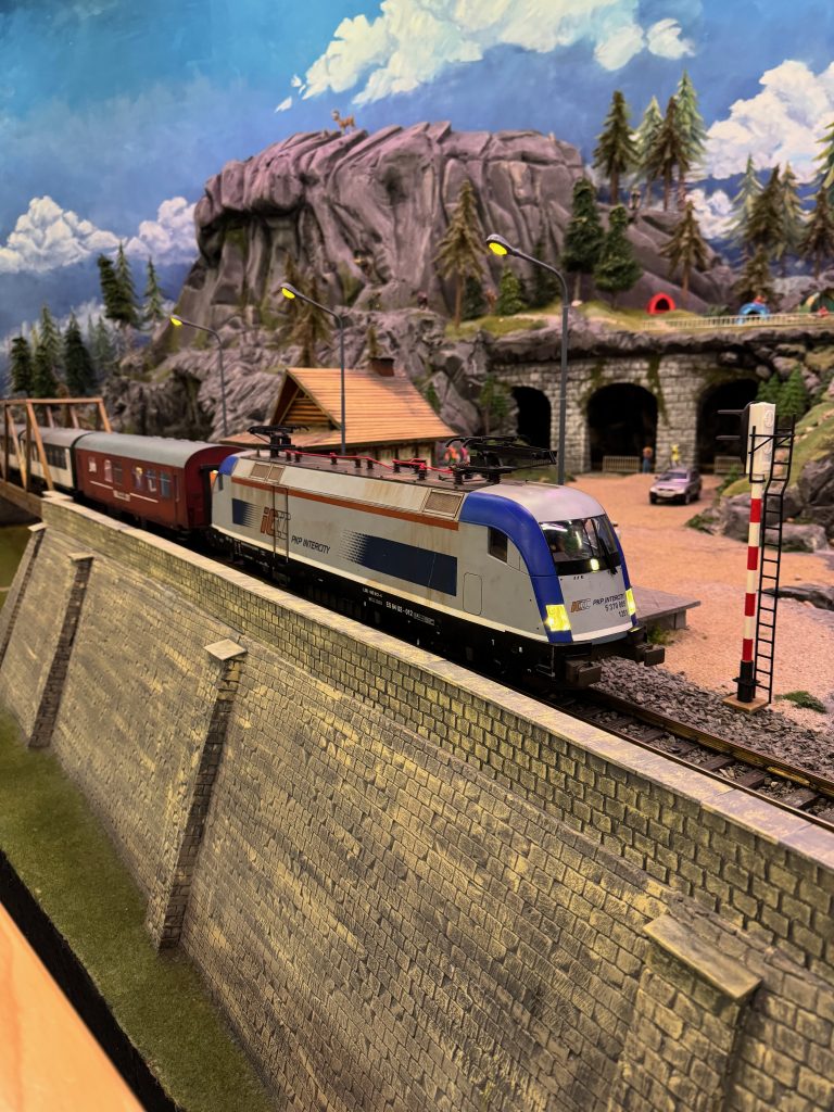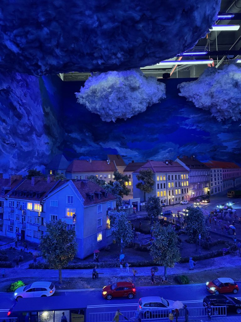 Odwiedziliśmy też Kolejkowo w SkyTower – wielką makietę kolejową, po której kursują nie tylko pociągi, ale też tramwaje, samochody, pływają statki. W ciągu kilkunastu minut dzień zmienia się w noc, pojawia się burza, a w innym rejonie makiety impreza na dachu nieukończonego parkingu.