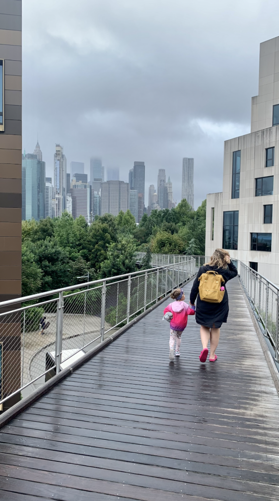 Po stronie Brooklynu ruszyliśmy w stronę Brooklyn Bridge Park – parku w pobliżu mostu z widokiem na Manhattan. Znajduje się tam kilka przystani (Pier) zagospodarowanych zielenią, placami zabaw, boiskami, punktami widokowymi. Jest tu też Squibb Park Bridge – wiszące w powietrzu ścieżki między drzewami z niesamowitym widokiem na Manhattan. Po drodze wzdłuż East River zachwycaliśmy się widokami na Manhattan, a pogoda wyraźnie się poprawiła. Zaczęło się przejaśniać i całkowicie przestało padać.
